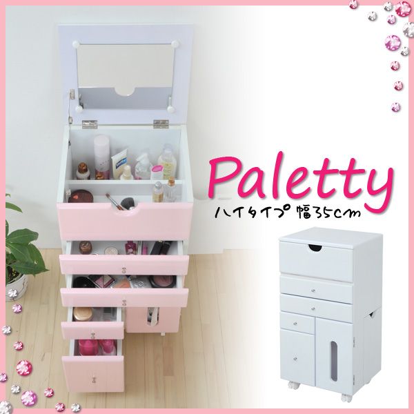コスメワゴン ハイタイプ ピンク (SL-003-PK) Palettyシリーズ 幅35 メイクボックス 鏡台 ミラー ドレッサー