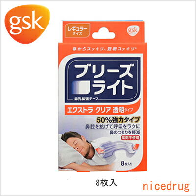 【グラクソ・スミスクライン】 ブリーズライト エクストラ クリア 透明タイプ レギュラー 8枚入鼻孔拡張テープ 縦約22mm×幅約60mm鼻のつまり・いびきを軽減