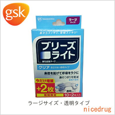 今だけ!2枚増量!!【グラクソ・スミスクライン】 ブリーズライト クリア目立たない透明タイプラージ 10枚+2枚入鼻孔拡張テープ 縦約19mm×幅約66mm鼻のつまり・いびきを軽減