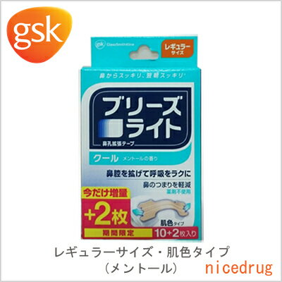 今だけ!2枚増量!!【グラクソ・スミスクライン】 ブリーズライト クールレギュラー 肌色 10枚+2枚入 メントールの香り鼻孔拡張テープ 縦約17mm×幅約55mm鼻のつまり・いびきを軽減